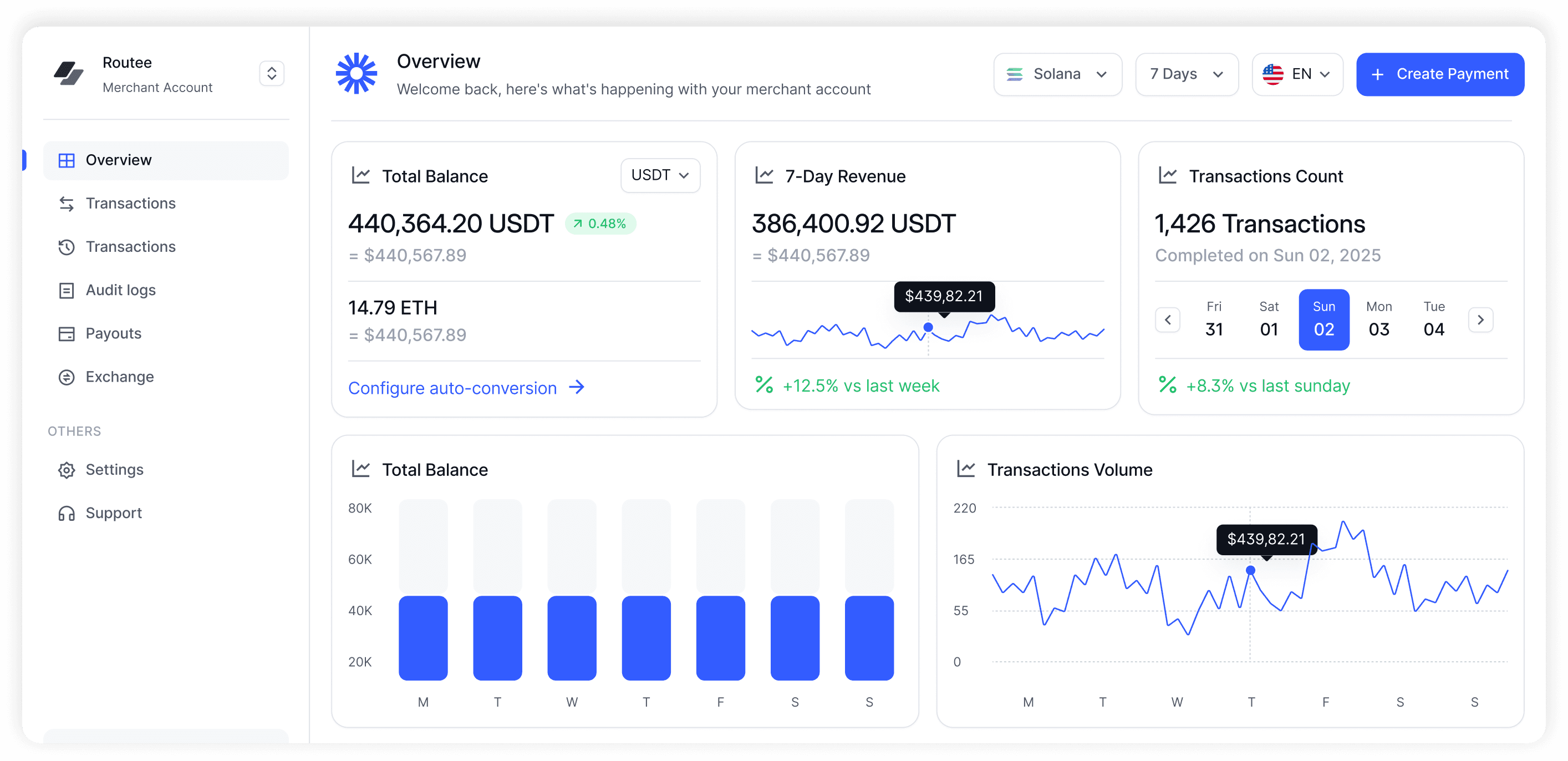 Pay for coffee, gadgets with a single QR scan — everything happens in seconds. Routee automatically converts USDT, ETH , SOL or and delivers funds instantly.